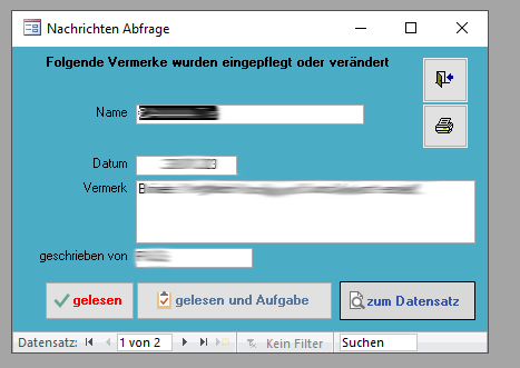 Die Suche ist eine SQL Abfrage mit dem Platzhalter (Like *<SUCHE>*) die sich beim Tippen „sofort“ aktualisiert. Ich kann hier also (wenn ORT aktiv ist) einfach <Kassel> eingeben und schon bekomme ich nur Datensätze die in <Kassel> wohnen, oder <Teststraße> dann kommen nur Anwohnerinnen und Anwohner. Oder eben <341>, dann werden alle Datensätze angezeigt in deren <PLZ> <341> vorkommt(!) und auch die Datensätze mit entsprechender <Hausnummer> 😉