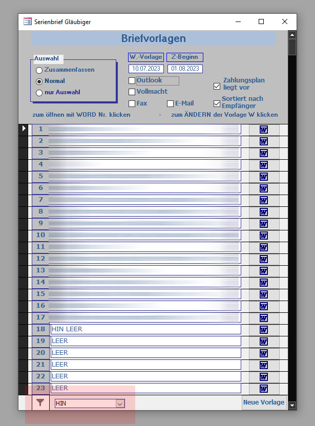 Bei den Filtern stellt das Feld <Zuständig> eine Besonderheit dar. Wenn ich der aktuelle Benutzer bin, steht dort <HIN> – weil ich der angemeldet Benutzer bin und nur Datensätze mit meiner <Kennnung> werden angezeigt. Wenn sich eine Person mit dem <Berufsfeld> <- VERWALTUNGSKRAFT –> angemeldet hat, wird dort automatisch <*> ausgewählt, also alle <Kennungen> werden angezeigt.