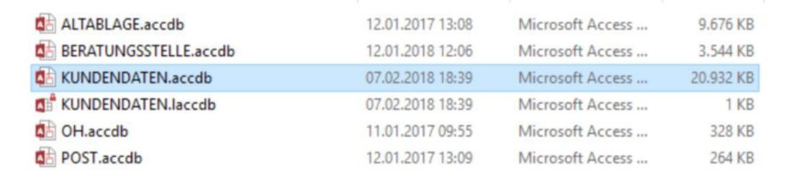 Typisch für diesen Fehler ist, dass nur die (defekte) Datei (hier) KUNDENDATEN.ACCDB (scheinbar) doppelt vorhanden ist.